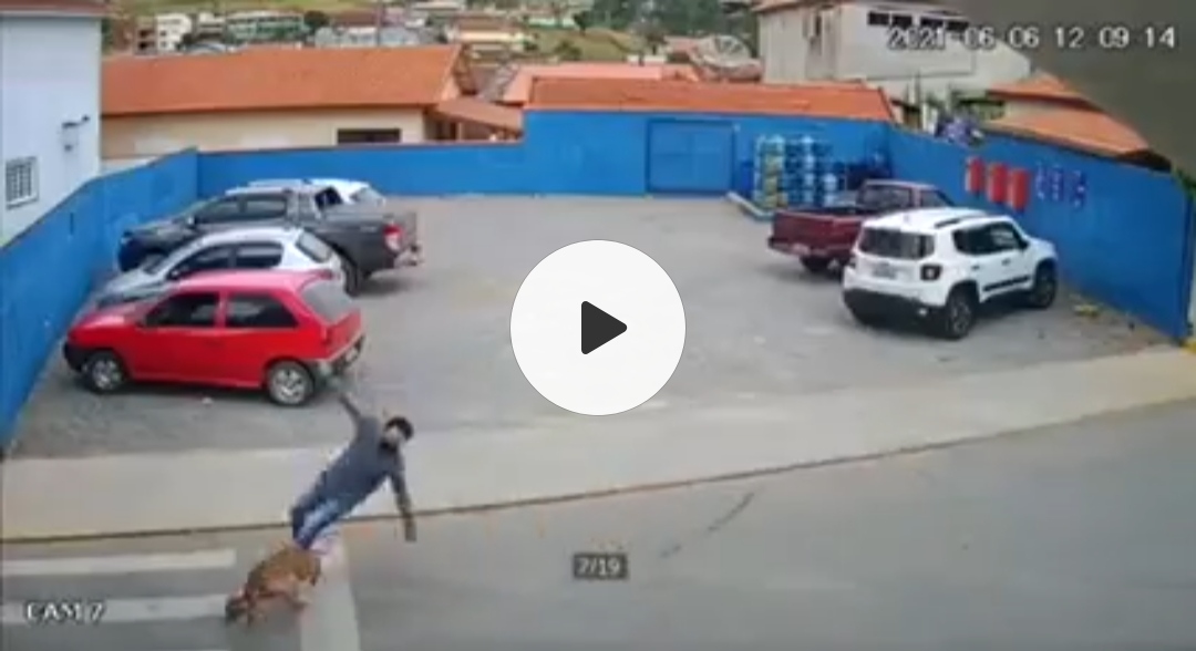 Câinele își vede de drum, în timp ce bărbatul se resimte după trânta pe care a luat-o, acuzând dureri la spate și la cap. În filmare se vede cum imediat ce pune piciorul pe carosabil, tânărul este izbit de un câine care alerga după o mașină.