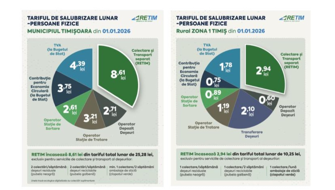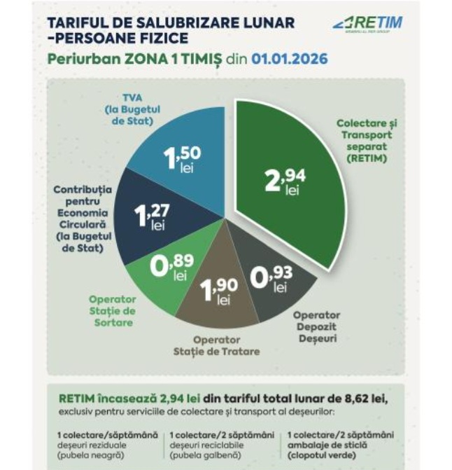 RETIM Ecologic Service S.A. informează toți utilizatorii serviciului de salubrizare (persoane fizice, asociații de proprietari/locatari, persoane juridice și instituții publice), Zona 1 Timiș, cu privire la modificarea tarifelor de facturare. Modificarea este determinată de ajustarea tarifelor de colectare și transport din Zona 1 Timișoara, aprobată prin Hotarârea AGA a Asociației de Dezvoltare Intercomunitară Deșeuri (ADID) Timiș nr. 5/20.01.2026.