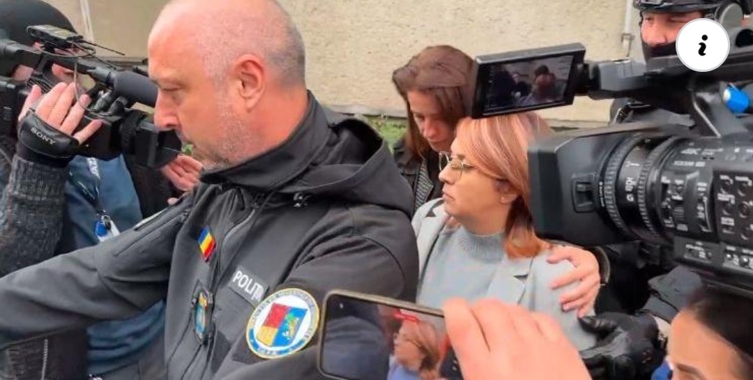 Flancată de mascaţi, Laura Crişan, fiica afaceristului, de profesie avocat, nu trădează nicio emoţie.