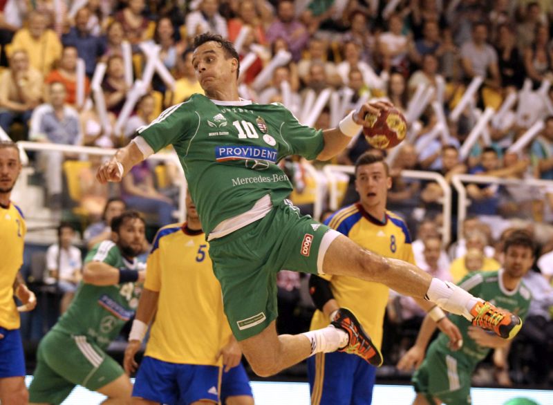 Harsányi Gergely a labdával a Magyarország – Románia férfi kézilabda felkészülési mérkõzésen NyÃregyházán, a Bujtosi csarnokban 2014. május 29-én.