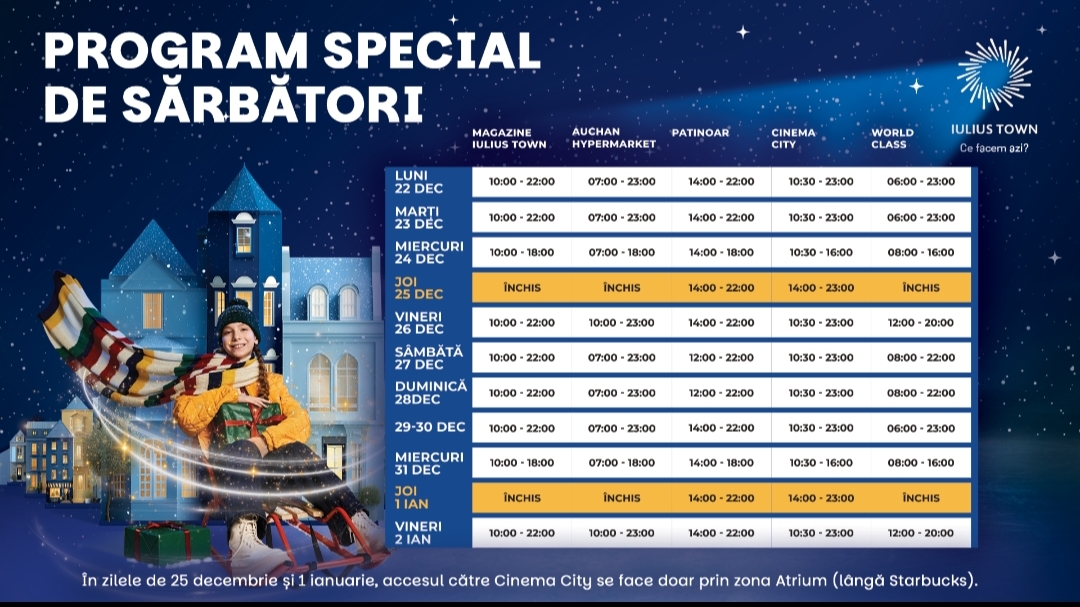 De sărbători, fiecare dintre noi își petrece timpul cu cei dragi și se bucură de momentele magice petrecute în familie. Iulius Town Timișoara are un special de sărbători încât să îți poți face ultimele cumpărături, dar și să te bucuri de experiențe. În prima zi de Crăciun și 1 ianuarie 2026, Cinema City și patinoarul din Iulius Gardens vor fi deschise.