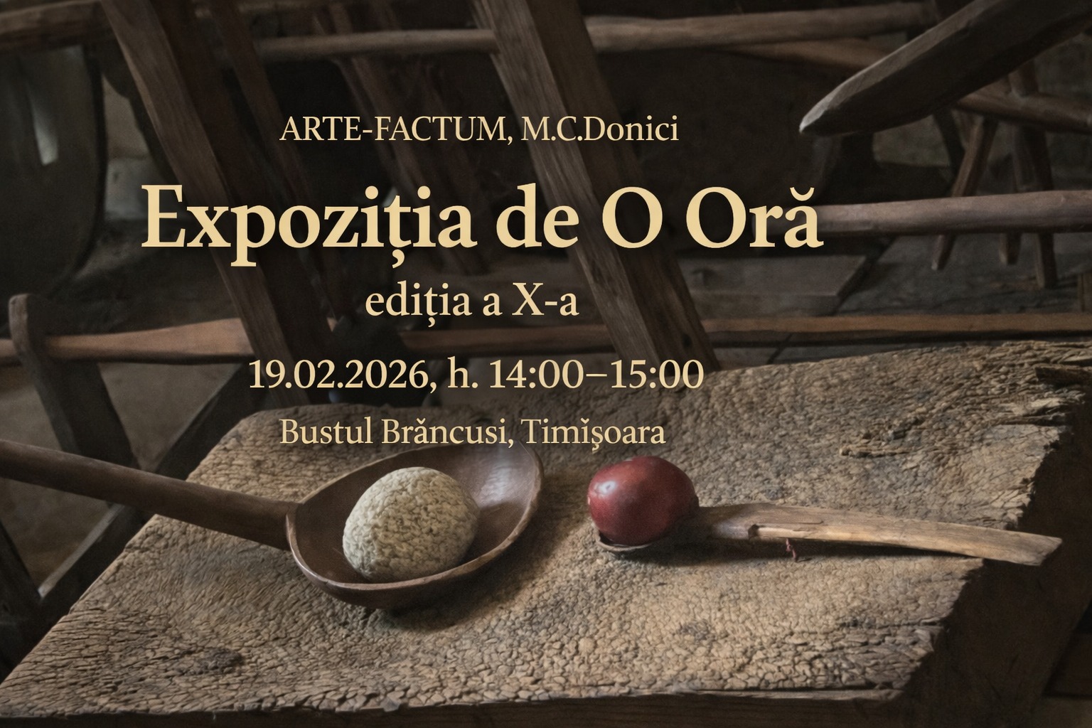 ”Brâncuși e formă, nu cuvânt, nu fotografie…. Expoziția de O oră este despre singurul român universal care a trebuit să plece pentru a schimba lumea formelor, după eclecticul Rodin! Lumea lui Brâncuși venea de la Țărani, de la Țară de la el. De 10 ani fac aceste rememorari neconvenționale la Bustul Brâncuși de lângă Facultatea de Arte Timișoara, 10 expoziții, mereu altfel, mereu cu prieteni care-l apreciază. La a 10-a ediție a evenimentului vor fi 16 lucrări de etnosculptură, creații ready -made cu artefacte originale din cultura populară, purtând miile de amprente al țăranilor care au inspirat universul formelor lui Brâncuși. Expoziția de O Oră se desfășoară între orele 14:00- 15:00, la Bustul Brâncuși. De la ora 16:00, expoziția se reașează în Holul Bibliotecii UPT, într-un spațiu generos, aflat mereu în calea studenților, unde au avut loc mai multe evenimente similare în decursul timpului”, transmite etnosculptorul M.C.Donici.