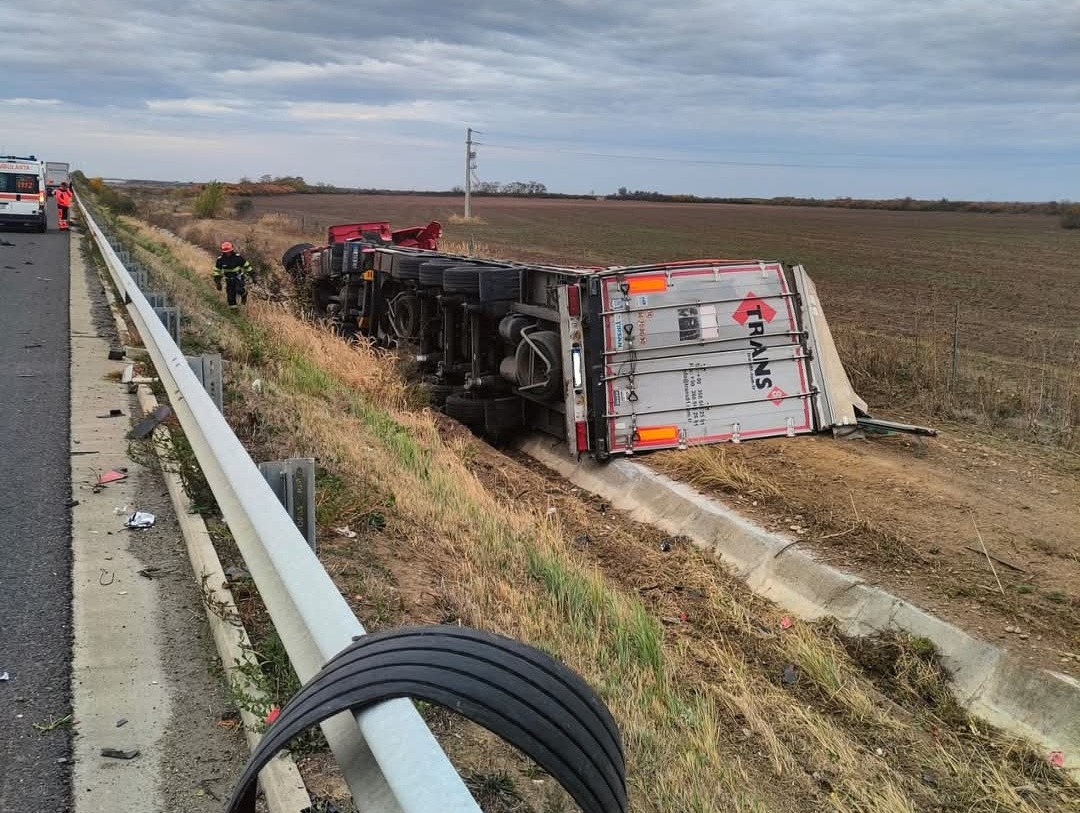 Un autotren a lovit parapetul marginal și s-a răsturnat în afara părții carosabile.