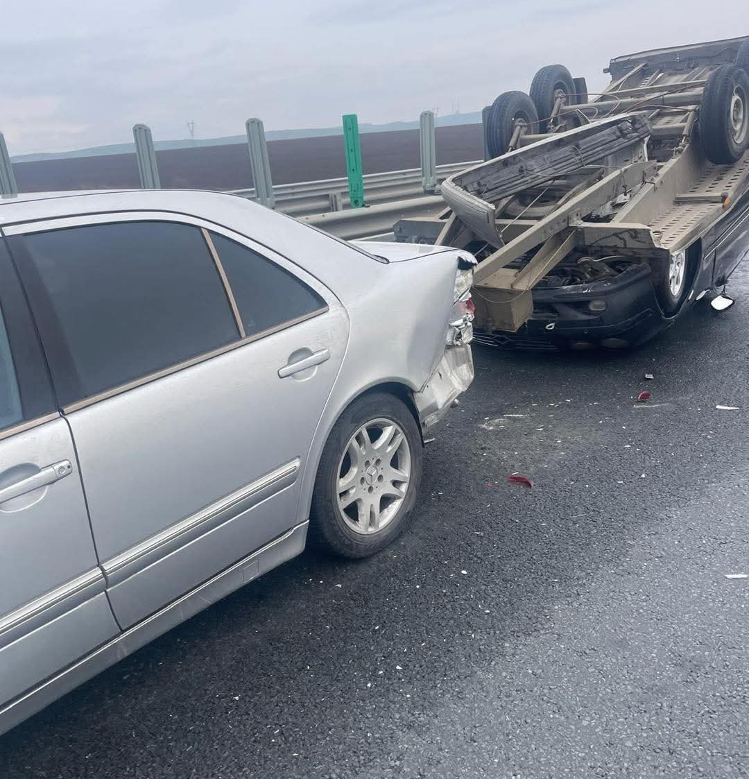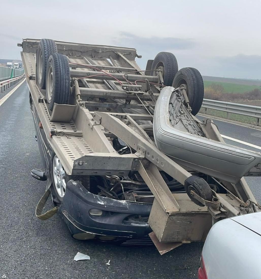 Un autoturism cu trailer, încărcat cu un al doilea autoturism, s-a răsturnat.