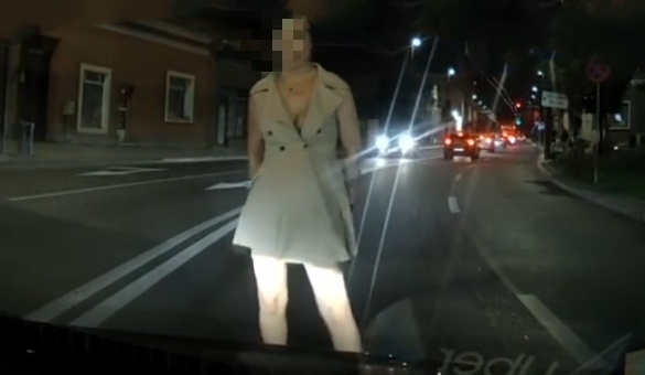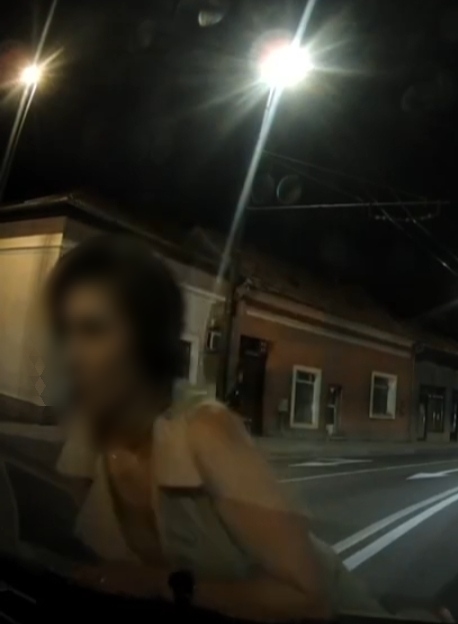 În timp ce se deplasa pe o stradă din oraș, o femeie i-a apărut brusc în fața mașinii, s-a așezat pe carosabil, apoi a urcat pe capota autoturismului.