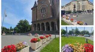 Splendoare de primăvară pe esplanada Catedralei Mitropolitane din Timișoara – petunii în culorile tricolorului românesc