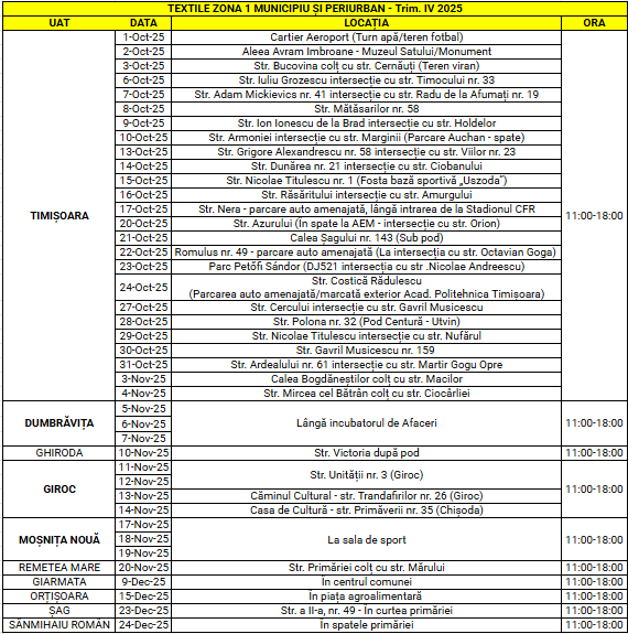 Utilizatorii casnici din localitățile menționate pot preda GRATUIT, prin aport voluntar, deșeurile textile la punctele de colectare stabilite, conform programului din tabelele* de mai jos: