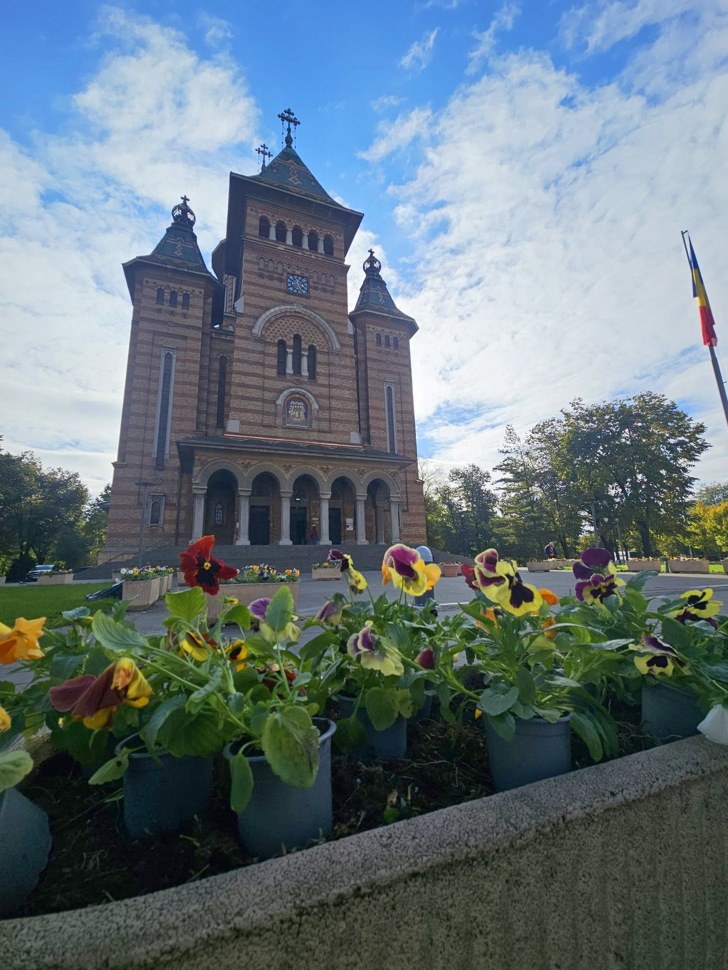 Așa cum în primăvară spațiul din fața Catedralei Mitropolitane din Timișoara a fost împodobit cu flori viu colorate — petunii și mușcate —, acum, odată cu venirea toamnei, locul s-a transformat din nou într-un colț de poveste.