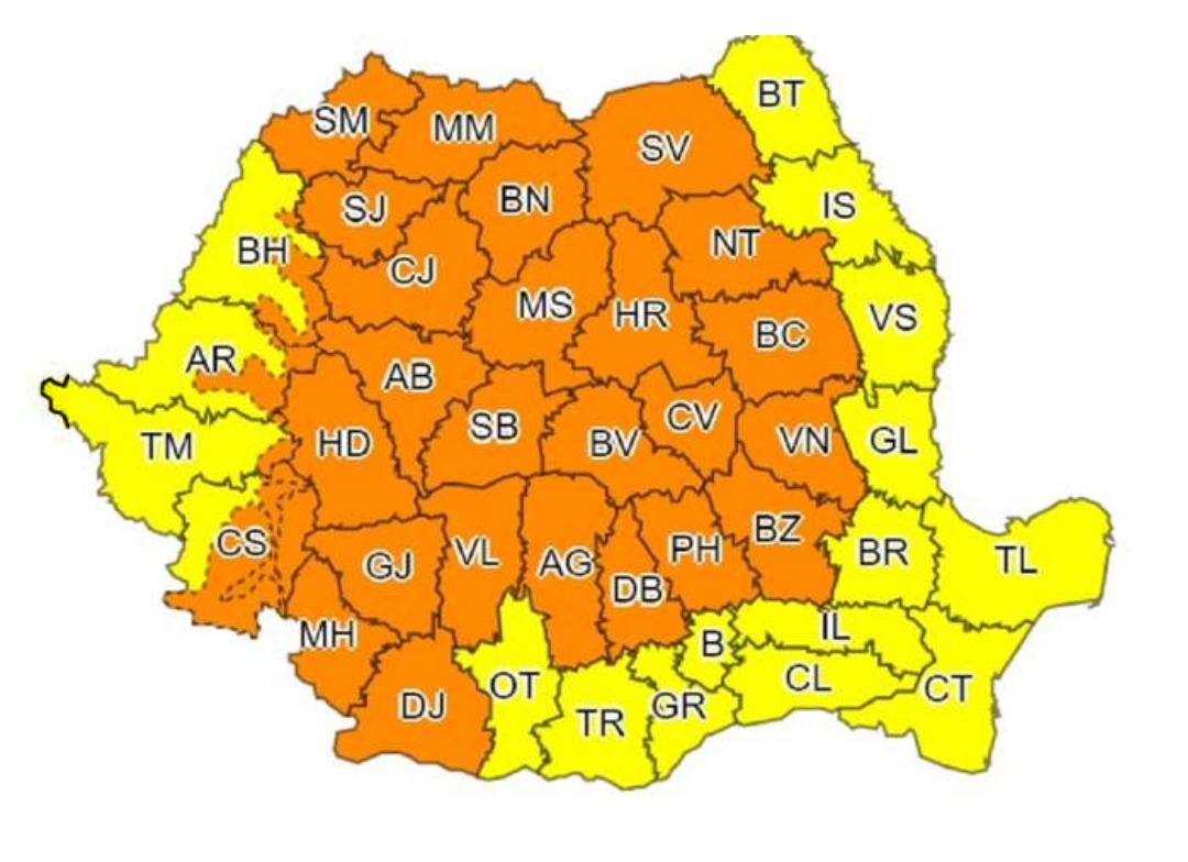 Meteorologii anunță că de vineri, de la ora 23.00 până duminică la ora 6.00, aproape toată țara este sub cod portocaliu de ploi, vijelii și grindină.